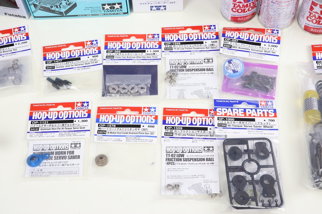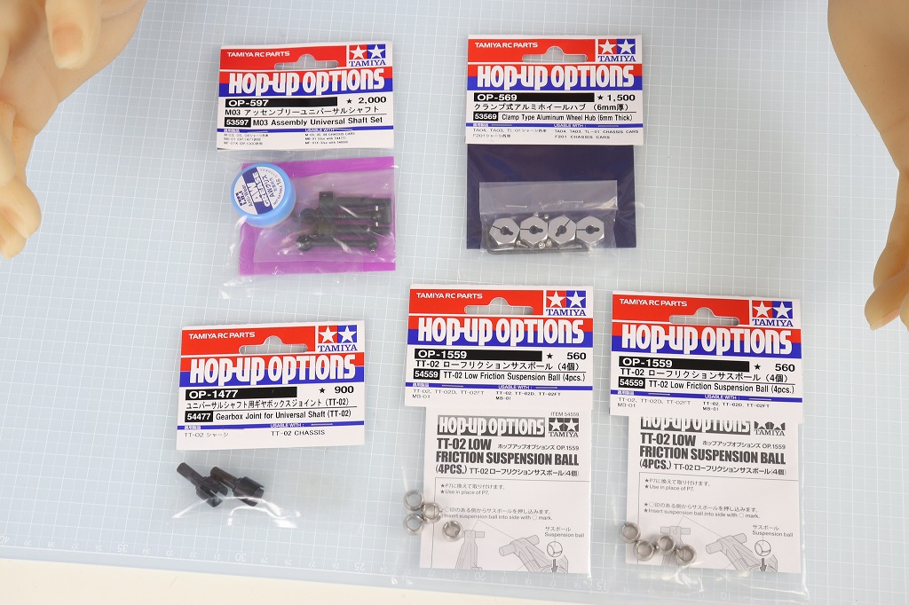 残りは、ユニバーサルシャフト&ジョイント、アルミホイールハブ、ローフリクションサスボールです。ローフリクションサスボールは2セット使います。定番のオプションパーツばかりです。