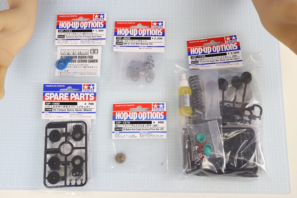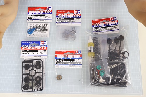 まずは、ベアリングセット、オイルダンパー、ハイトルクサーボセイバー&アルミホーン、ピニオンギヤです。