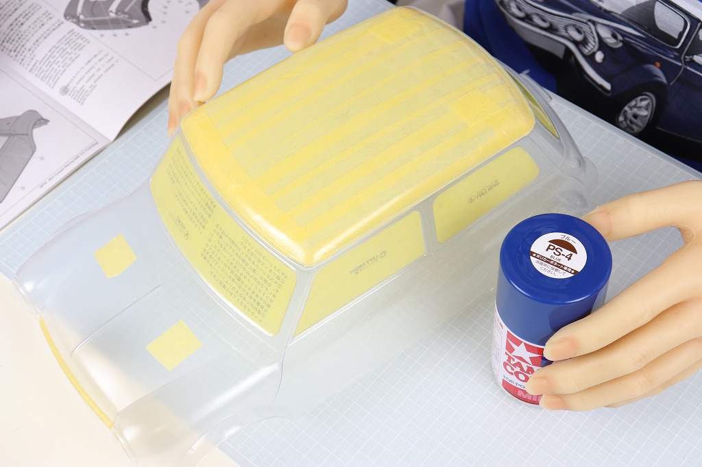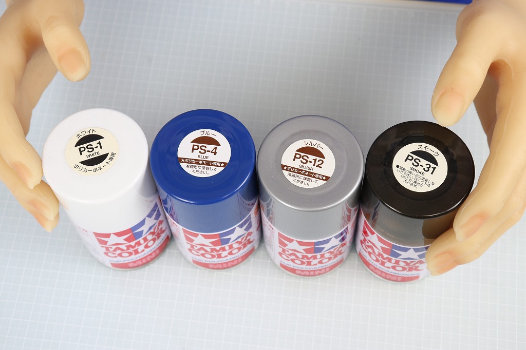 塗料を紹介します。まずは1本目、全体に「ブルー(PS-4)」をスプレーします。