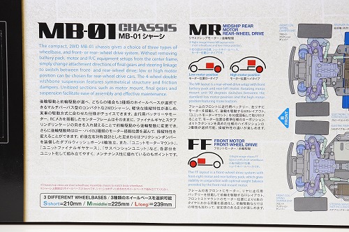 ちなみに、「MB-01」シャーシは、前輪駆動と後輪駆動が選べ、どちらの場合でもホイールベースを3種類から選ぶことができる、2DWのマルチシャーシです。