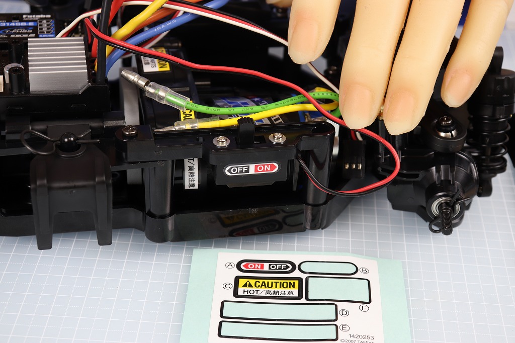 スイッチはモーターの隣にネジ止めし、ON-OFFシールを貼っておきます。