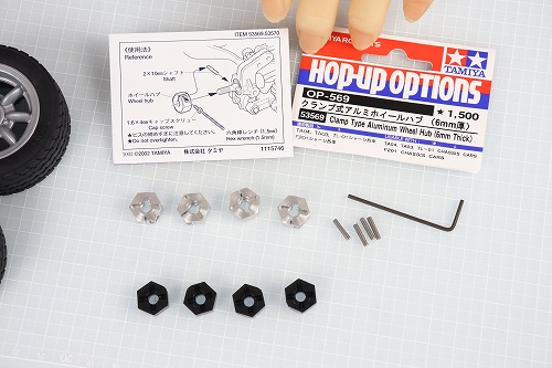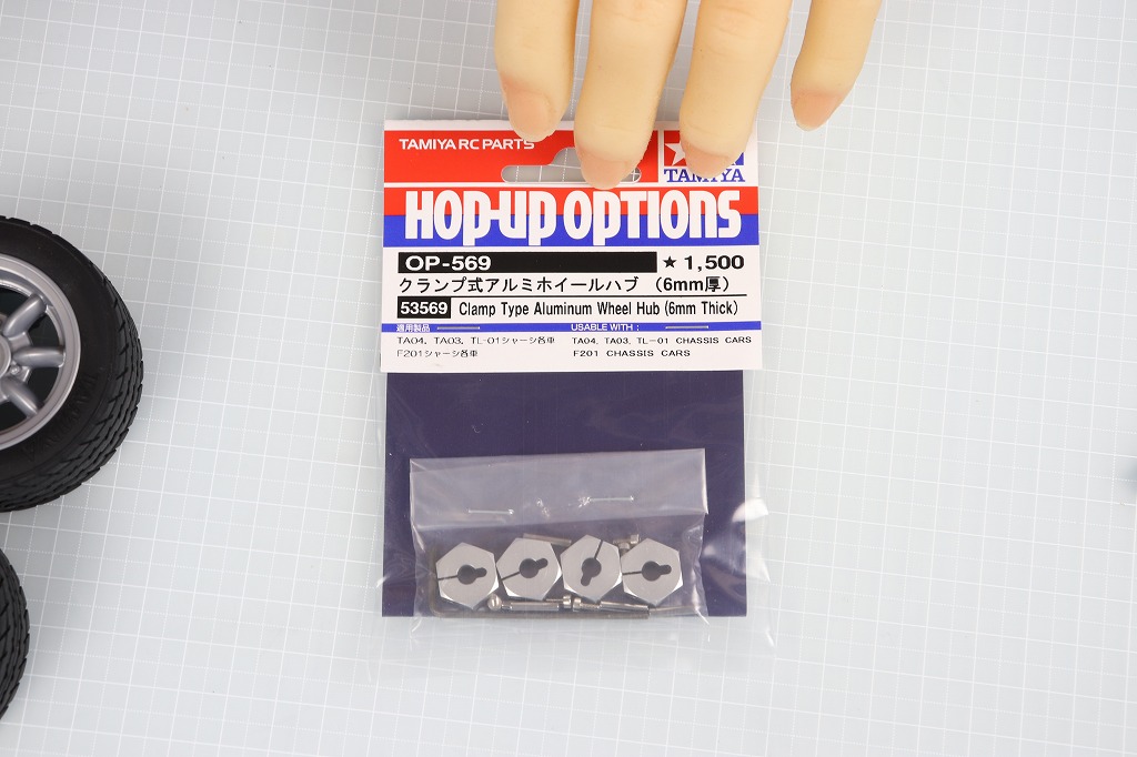 タイヤを取り付ける前に、最後のオプションパーツ「OP-569 クランプ式アルミホイールハブ(6㎜厚)」の出番です。
