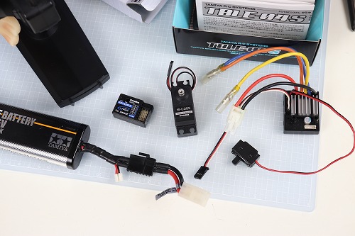 開封しました。何度も使っているパーツなので、詳細は省略します。スピードコントローラーは新品ではなく、「スカッシュバン」から外したものなので、ブラシモーター用に設定済みです。
