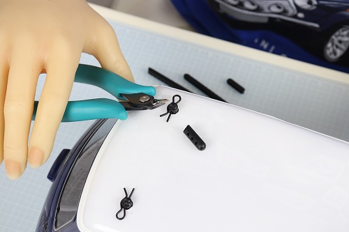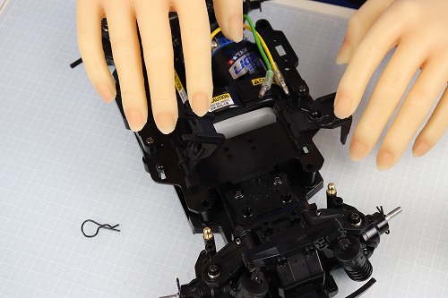 サーボを付ける前に、バッテリーホルダーをスナップピンで固定します。