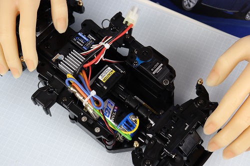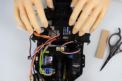 受信機とスピードコントローラーは両面テープで貼り付けます。さて、どこに付けようか…