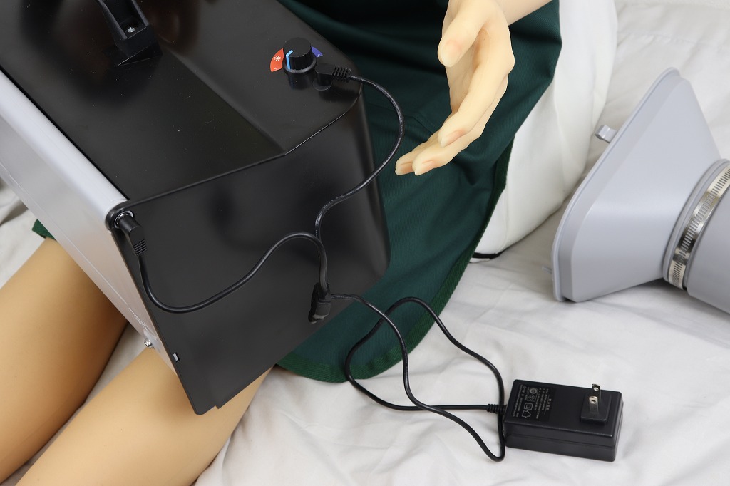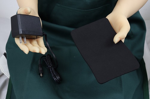 内容品を紹介します。まずは、エアーを発生させるコンプレッサー本体です。私の体に比べ、かなり小さいのが分かると思います。
