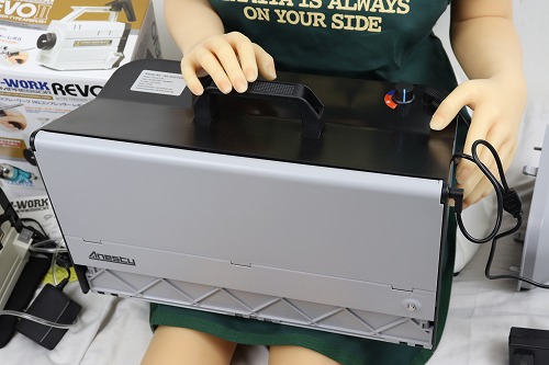 取っ手が付いたシンプルなデザインです。サイズはW185mm×D90mm×H185mmで、最大圧力約0.11MPa(約1.1kgf/cm2)、空気吐出量20(リットル/分)です。