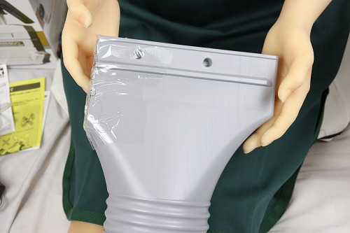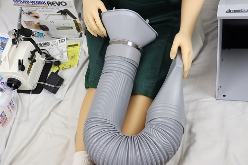 ダクトの先端ですが、私は少しカットしています。なぜカットしたかというと、いつも玄関で塗装しており、排気を新聞受けから行っている為、新聞受けのサイズにカットしたのです。これなら窓やドアを開けっ放しにする必要がありません。