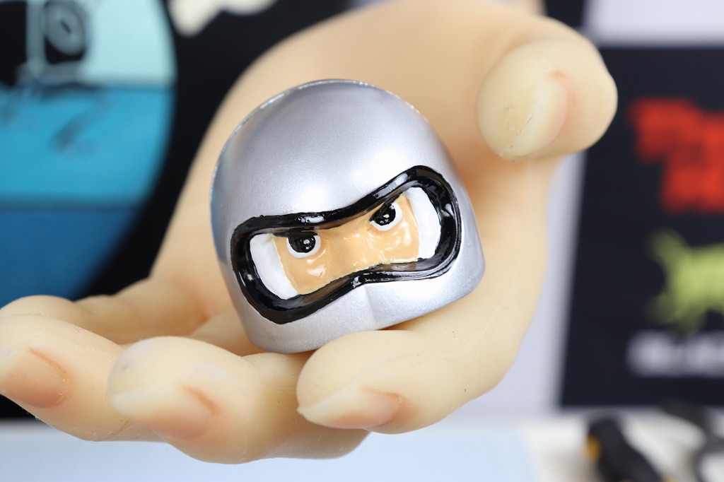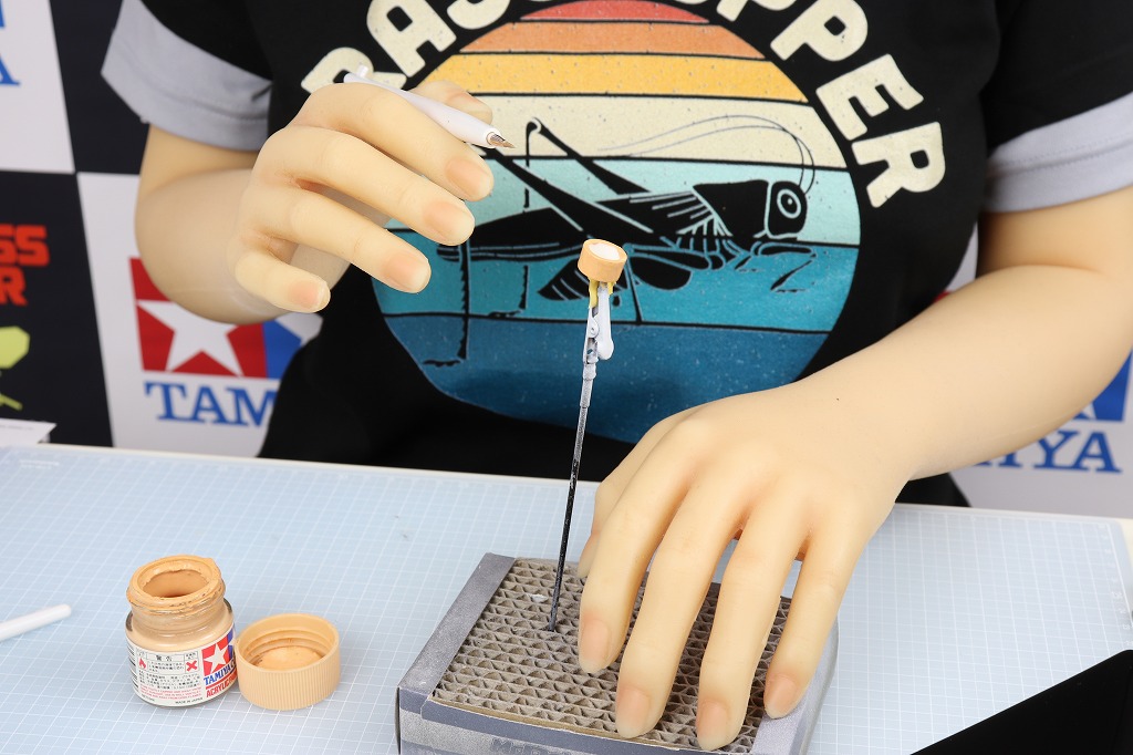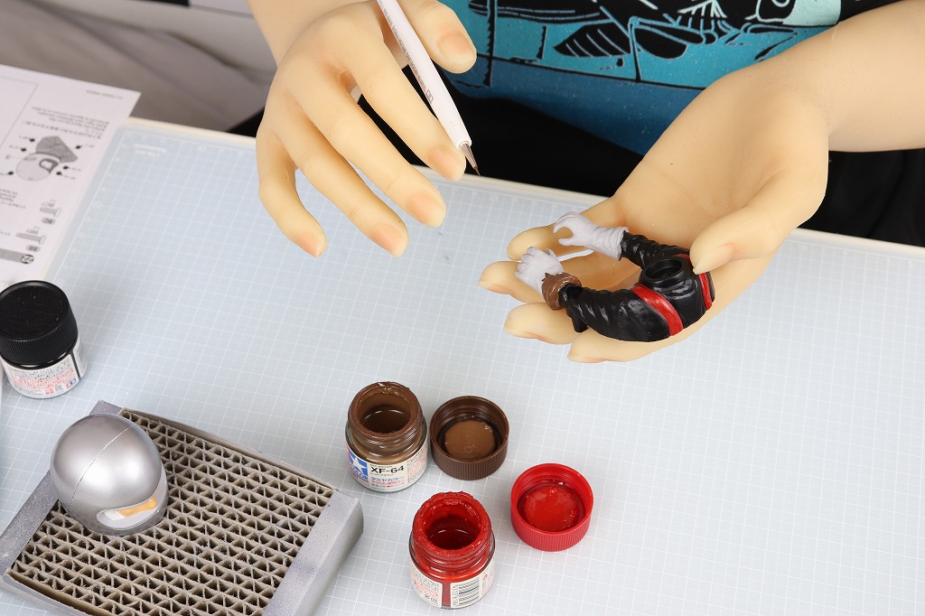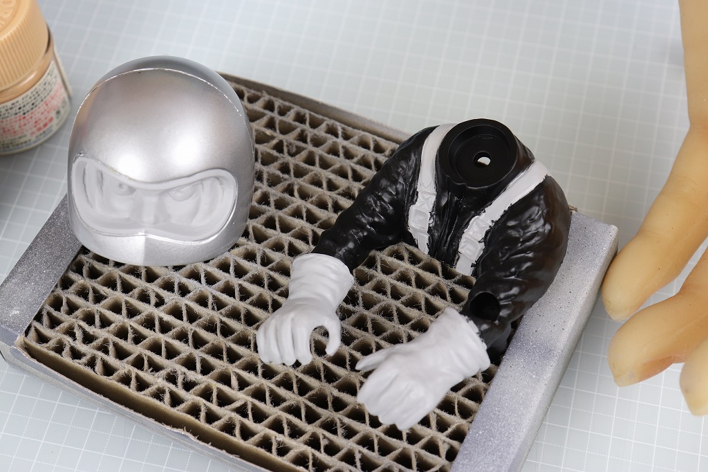 筆塗りは薄い色から塗ります。まずは、目と顔の周りを白で塗り、シートベルトの金具をシルバーで塗ります。