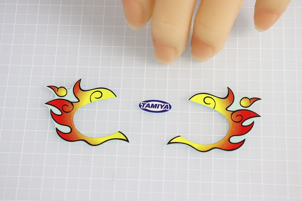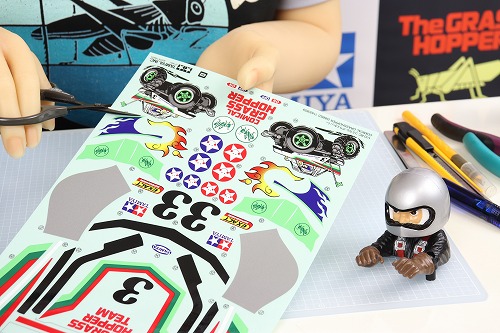 好きな位置に貼り付けるだけです。これなら、シャーシに穴あけする必要がなく、位置も自由に変えられます。ただ、「コミカルグラスホッパー」のMパーツを、カスタマーサービスやラジコンショップで購入する必要があるのが難点です。