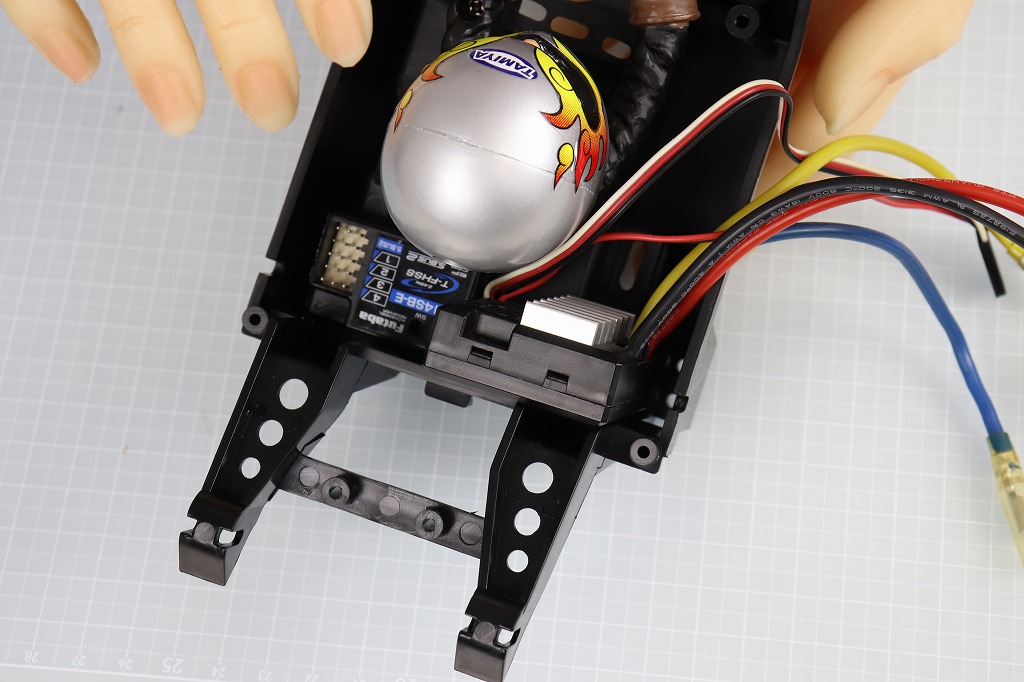 ボディを乗せるとこんな感じです。電動パーツのスペースを考え、前側に付けました。