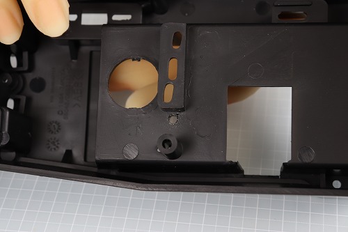 あける位置は、四角い出っ張りの少し横です。板厚は2㎜程度なので、ネジバカに注意です。