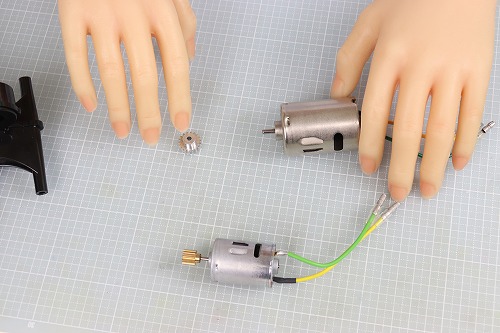 代わりに、普通の540モーターを使います。540モーターを使う場合、18歯(モジュール0.8)のピニオンギヤが必要です。ちなみに、これは以前作った「ワイルドワンオフローダー BLOCKHEAD MOTORS」の余りです。