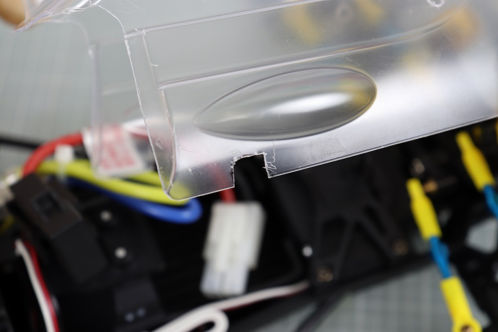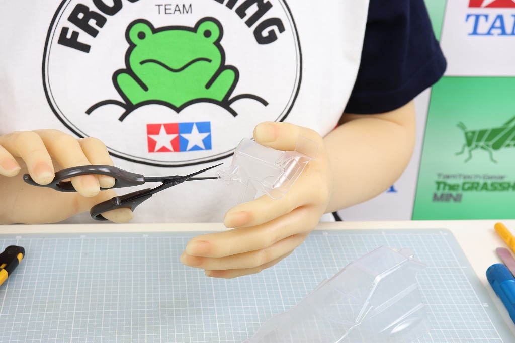 次は、交換するボディの塗装準備です。まずは、グラスホッパーミニのボディをカットします。カッターで外周をなぞり…