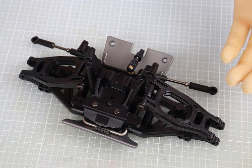 これにフロントロワアームをU字シャフトで固定します。このロワアームをひっくり返して取り付けると、ロングホイールベースになります。