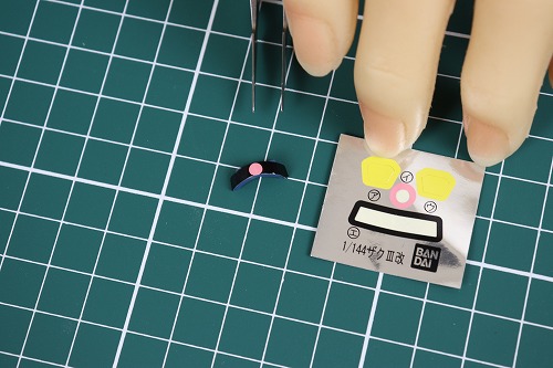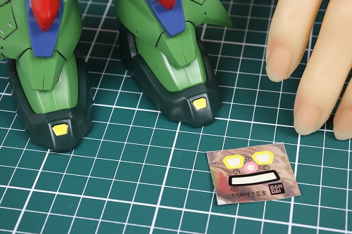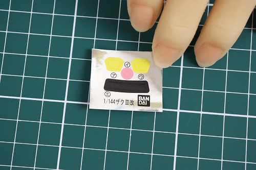 次は、頭部の組み立てですが、眼のパーツに単眼のシールを貼ります。