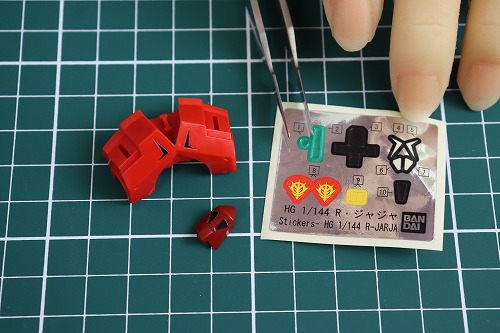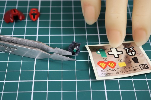 次は、頭部の組み立てですが、眼のパーツに単眼のシールを貼ります。
