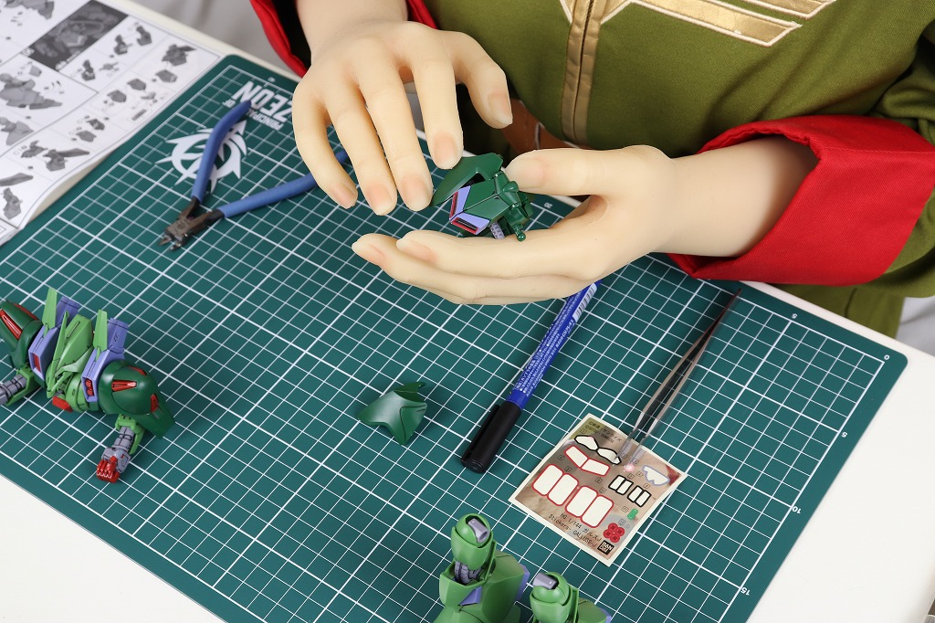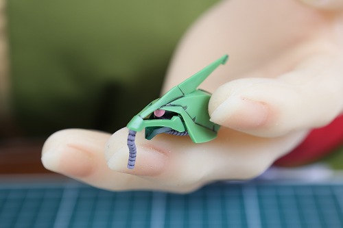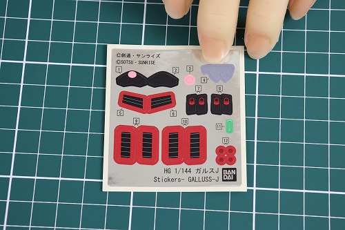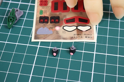 次は、頭部の組み立てですが、眼のパーツに単眼のシールを貼ります。単眼は位置が固定されたものと、自由に位置を決められるものの2種類あり、眼のパーツも2種類あります。