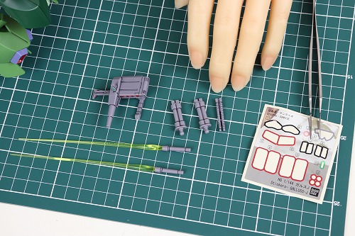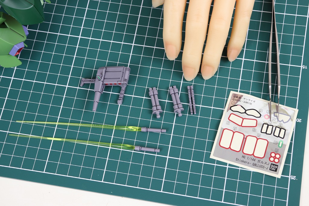 あと、組み立ては省略しますが、エネルギー・ガン、ビーム・サーベル2本、腕を伸ばすパーツがあります。武器に貼ったシールでカラーシールは全て使い切りました。