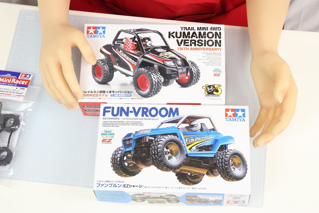 で、作るのは、トレイルミニ四駆「ファンブルン」と「くまモンバージョン」の2台です。どちらも同じ「EZシャーシ」です。「EZシャーシ」は、スピードが出ない代わりに、ダブルシャフトモーターを搭載し、坂道や凸凹路面に特化した新シャーシです。