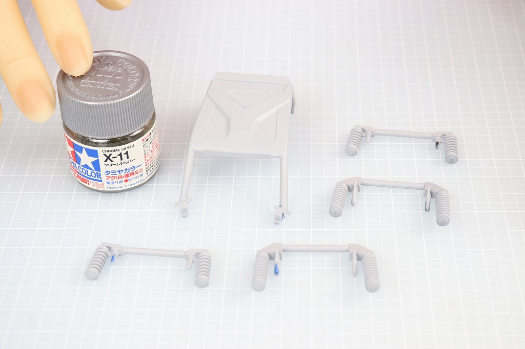 「ファンブルン」のルーフとダンパー及び「くまモンバージョン」のダンパーは、全体に「クロームシルバー(X-11)」を塗ります。