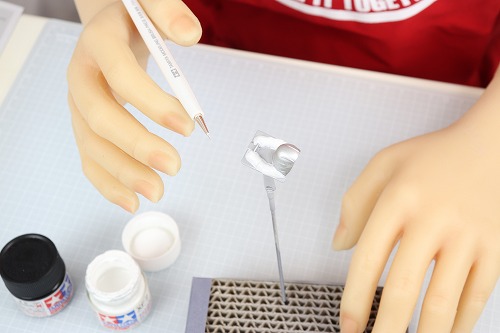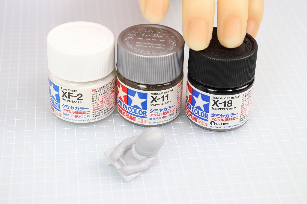 「ファンブルン」のドライバー人形は、「フラットホワイト(XF-2)」「クロームシルバー(X-11)」「セミグロスブラック(X-18)」で筆塗りします。