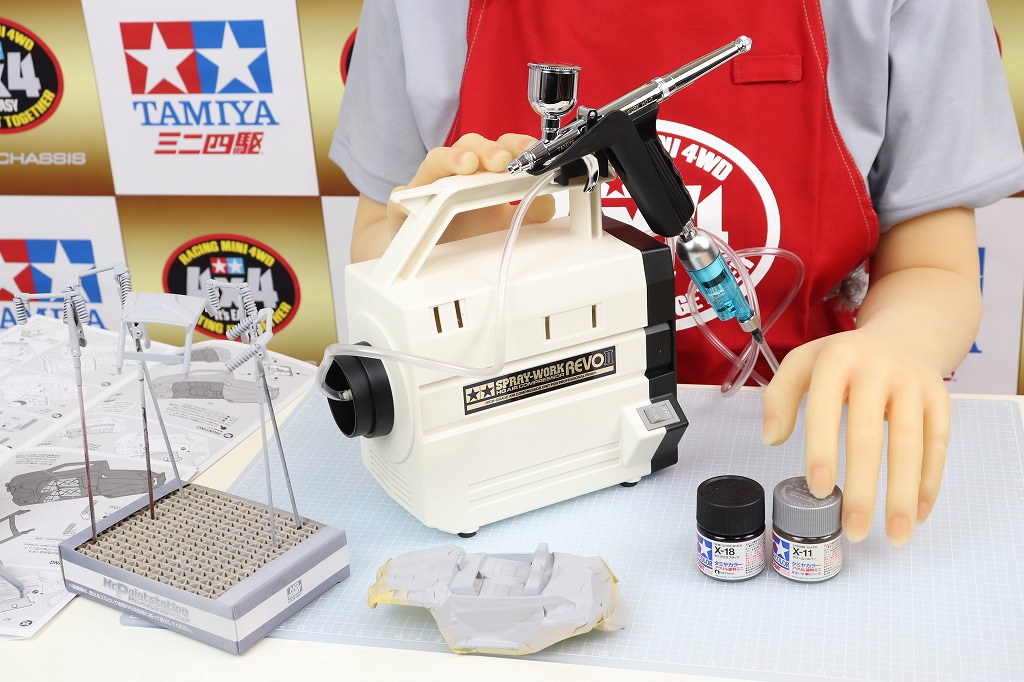 ちなみに、「クロームシルバー(X-11)」と「セミグロスブラック(X-18)」は、練習も兼ねてエアーブラシを使って塗装します。