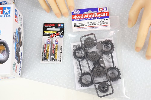 あと、オプションパーツとして、EZシャーシ用のスパイクタイヤ&ホイールと、ミニ四駆専用の単3乾電池も買いました。