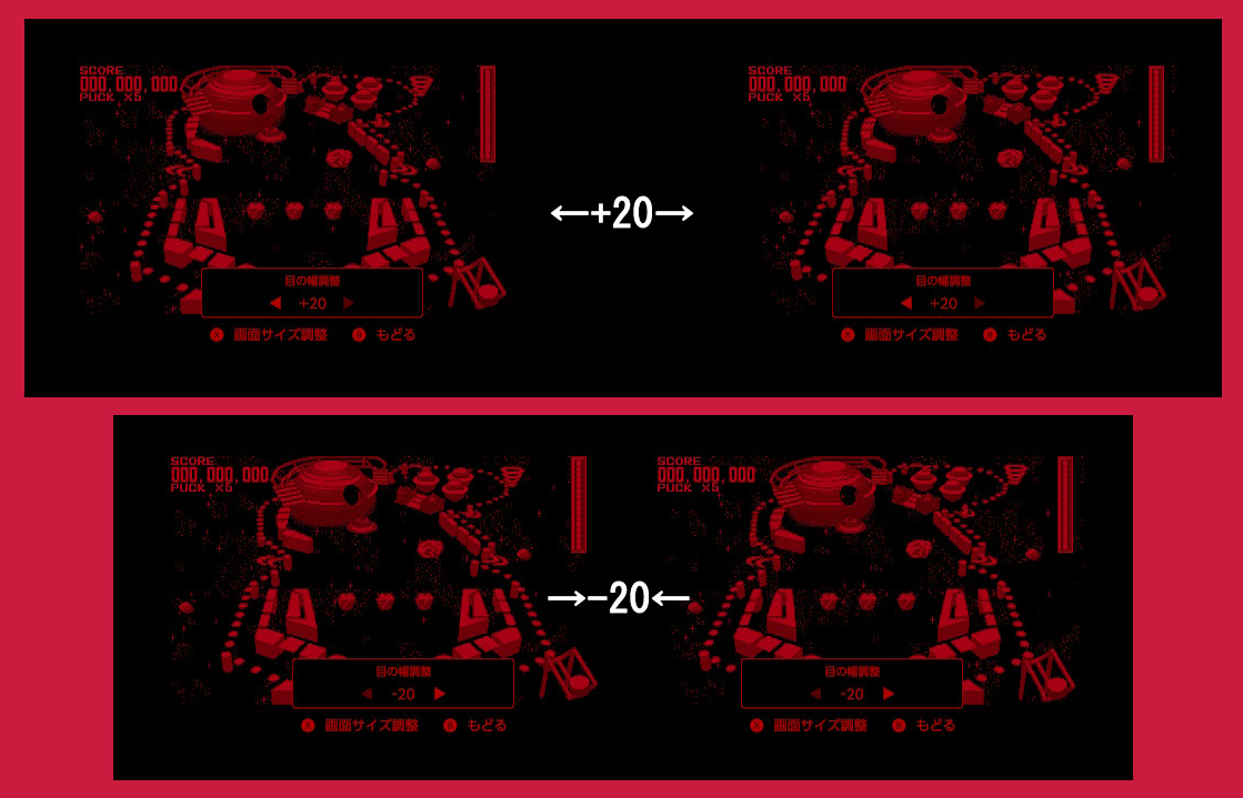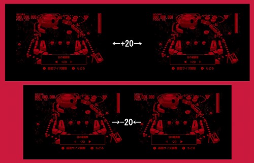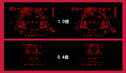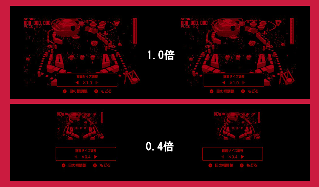 さらに、目の幅調整中にXボタンを押すと、「画面サイズ調整」に切り替わります。サイズはSwitchで「0.4倍~1.0倍」、Switch 2で「0.5倍~1.3倍」と倍率が異なります。